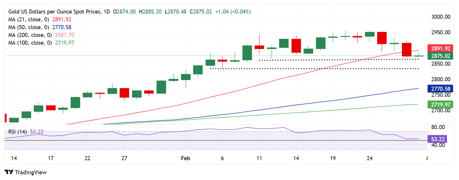The daily chart shows that Gold price closed Thursday below the critical short-term support of the 21-day Simple Moving Average (SMA) at $2,890, inducing further downward pressure.