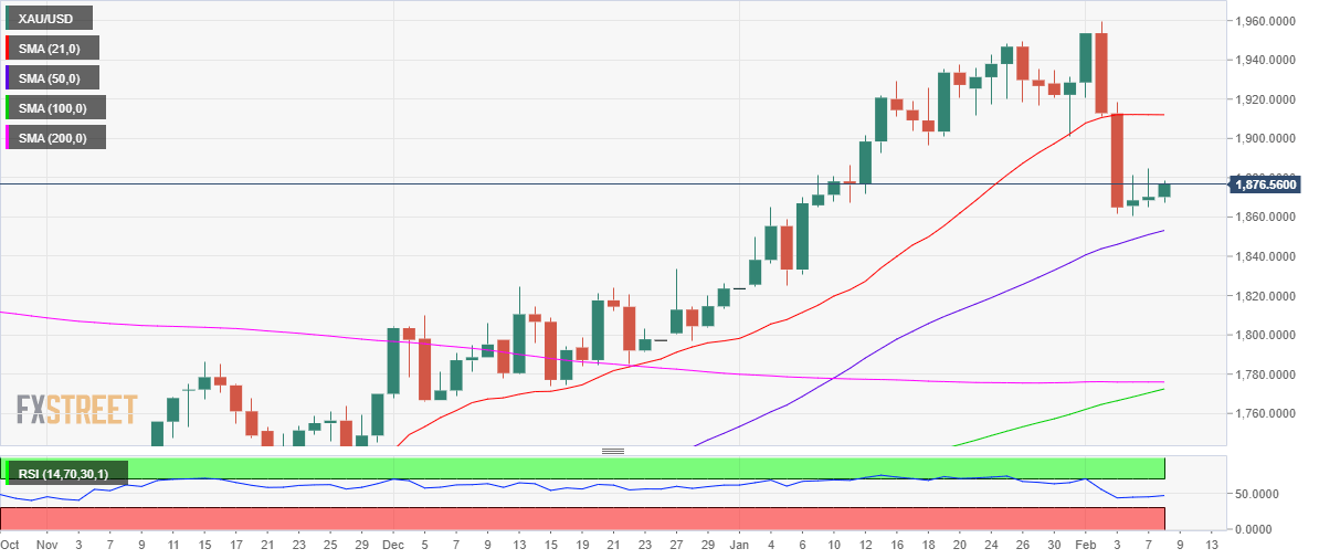 On the flip side, the four-week low of $1,860 is the immediate support, below which the bullish 50DMA at $1,853 could rescue bulls.
