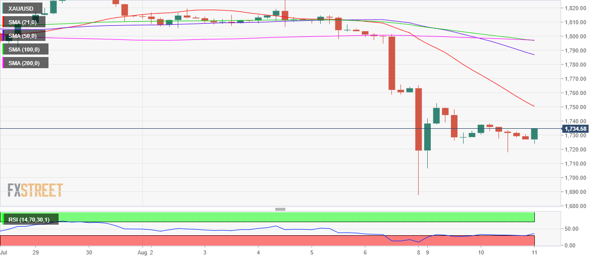 After a tumultuous start to a relatively light week on Monday, gold price licked it wounds and tried to stabilize around $1720-$1730 levels. The yellow metal sustained its recovery from five-month lows of $1688, although finished the day marginally lower amid persistent strength in the US dollar alongside the Treasury yields. The Fed’s tapering expectations remained the main narrative driving the markets, which weighed heavily on the non-yielding gold. However, the mounting fears over the economic impact of the Delta covid variant flareups helped to somewhat lift the pressure off gold price. Meanwhile, gold price also managed to find some support from the US Senate passage of the bipartisan $1 trillion infrastructure bill.