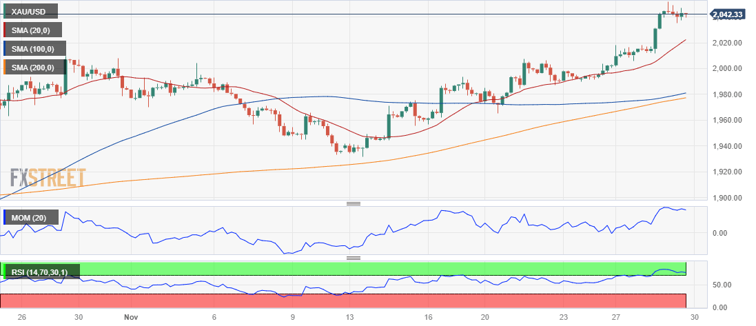 The daily chart for the XAU/USD pair shows that bulls have paused but retain control. The pair posted a higher high and a higher low while extending its advance above all its moving averages. Technical indicators, in the meantime, have lost their bullish strength, currently consolidating near overbought readings.