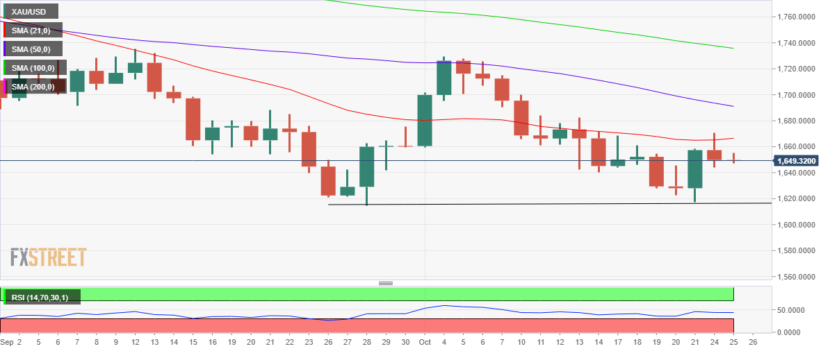 XAU/USD price started the week on a volatile note, initially climbing above $1,670 before closing Monday in the red just below $1,650. The yellow metal rallied hard in the first half of the day, as the US dollar extended its corrective decline amid the renewed market optimism, as Rishi Sunak took over the UK’s premiership. Markets remained hopeful that Sunak could eventually bring stability and relief to the country’s financial markets. Further, the non-interest-bearing also benefitted from soft US S&P Global Manufacturing and Services PMIs, which raised hopes that the Fed could begin to slow its pace of policy tightening later in the year. Easing Fed rate hike expectations lifted the sentiment on Wall Street, which resulted in fresh selling in the bullion.