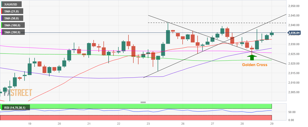 Acceptance above the two-week high of $2,041 is needed to continue to the bullish momentum toward the $2,050 psychological barrier.