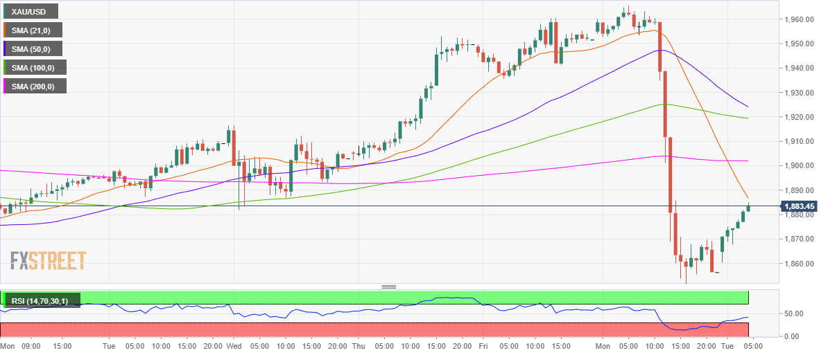 Gold challenges the bearish 21-hourly moving average (HMA) hurdle at $1887 on its road to recovery from multi-week troughs.