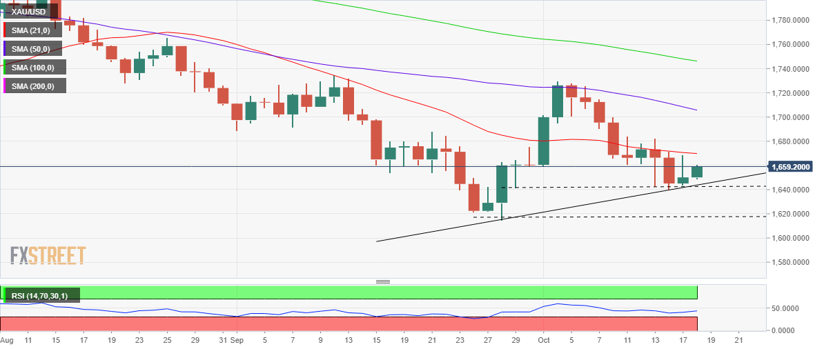 Gold price has found new support in the rising trendline at $1,644, which is connecting the 2022 lows and Friday’s low.