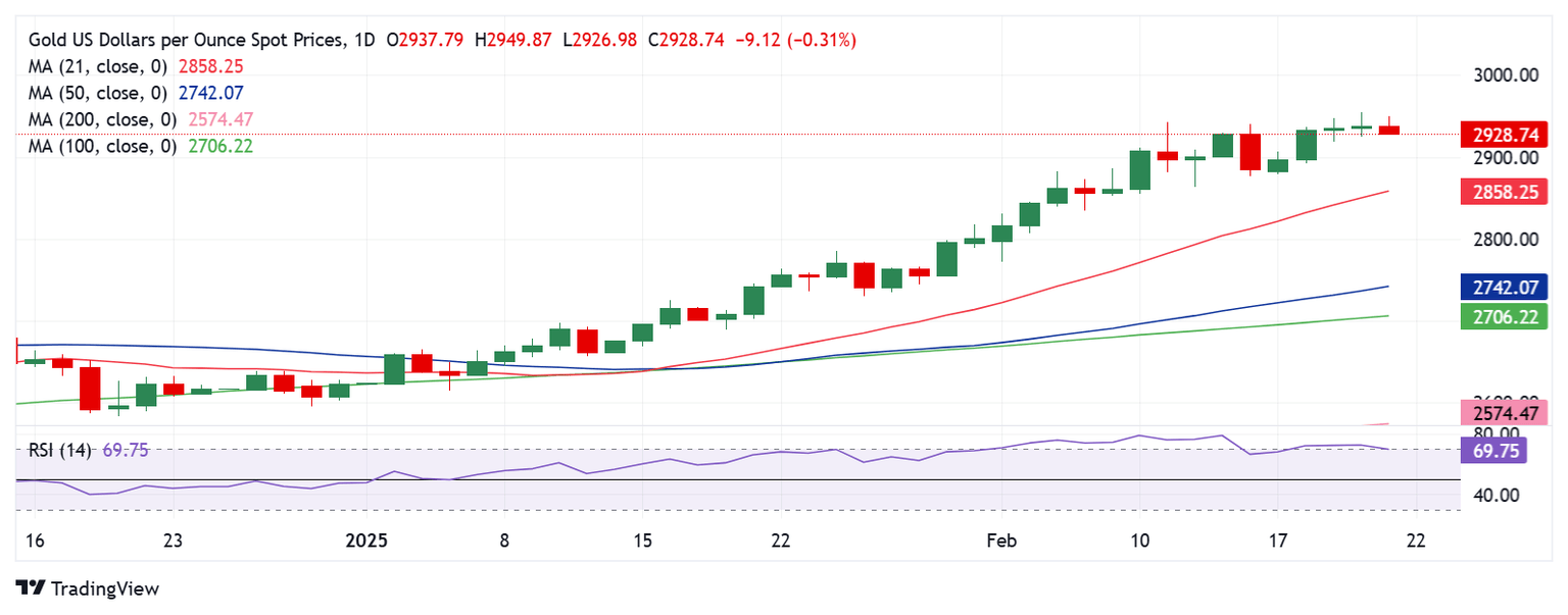 Gold price is on a corrective move lower from near record highs of $2,955 set on Thursday. Despite the pullback, Gold price remains on track to book the eighth consecutive weekly gain.