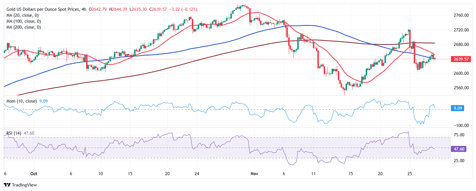 The daily for XAU/USD shows it currently hovers around $2,640, up for a second consecutive day. The risk, however, skews to the downside. Sellers rejected buyers around a bearish 20 Simple Moving Average (SMA), while technical indicators remain within negative levels, with neutral-to-bearish slopes. The 100 and 200 SMAs, in the meantime, keep heading higher below the current level, with the 100 SMA providing dynamic support at around $2,568.40.