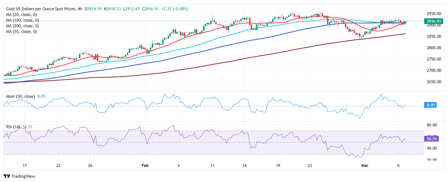 The near-term picture shows buyers battling to retain control. The XAU/USD pair is currently developing above all its moving averages, although a flat 100 SMA stands at $2,911.50. The 20 SMA, in the meantime, advances below the longer one. Finally, technical indicators diverge around their midlines, with the Momentum indicator aiming lower yet the Relative Strength Index (RSI) advancing. The bearish potential remains limited, with dips likely to keep attracting buyers.