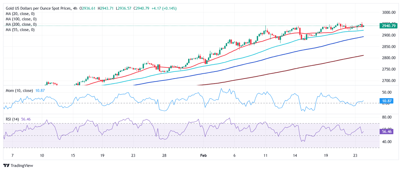 Technically, the daily chart for the XAU/USD pair shows it trades within a well-limited range for a fourth consecutive day, albeit the risk remains skewed to the upside. The Relative Strength Index (RSI) indicator extends its consolidative phase at around 71, while the Momentum indicator eased from its recent highs but remains well above its midline. Finally, moving averages maintain their firmly bullish slopes far above the current level, with the 20 Simple Moving Average (SMA) providing dynamic support at around $2,872.