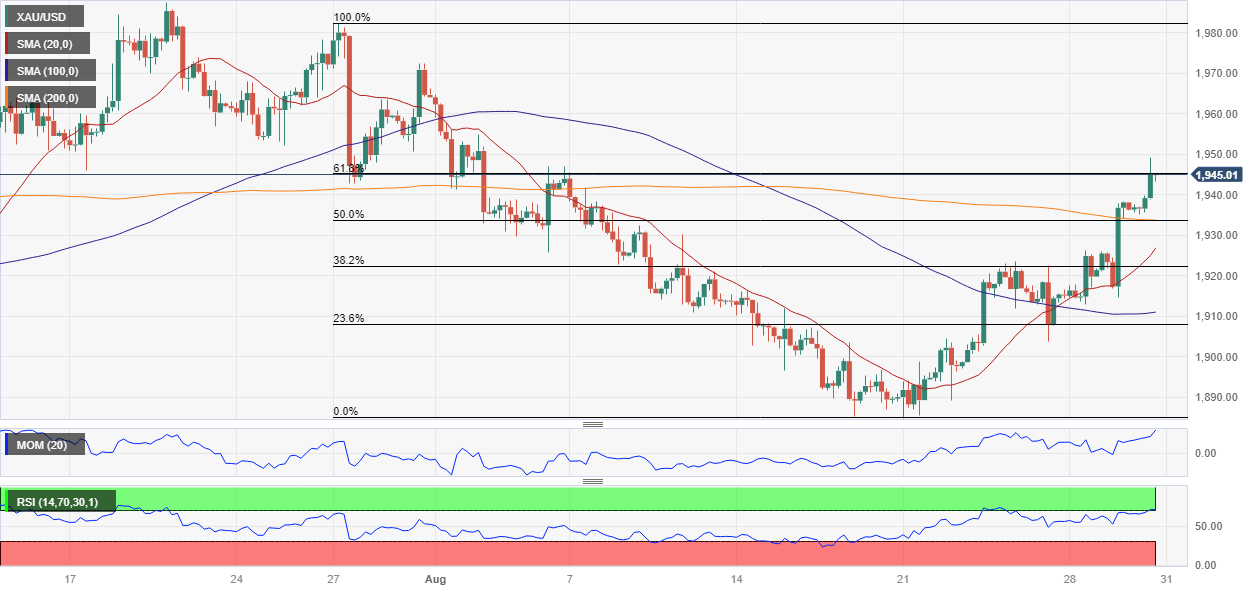 The XAU/USD pair is currently hovering around the 61.8% Fibonacci retracement of the $1,982.12/$1,884.77 decline at $1.944.85, maintaining the bullish tone. The daily chart shows that technical indicators have partially lost their upward momentum but continue to advance within positive levels. At the same time, Gold is above the 20 and 200 Simple Moving Averages (SMAs) and nears a mildly bearish 100 SMA at $1,955.80.