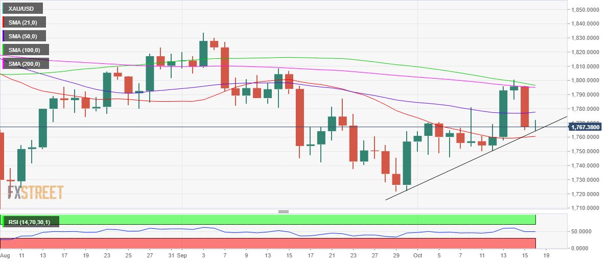 Gold price is pressuring lows near $1765, at the time of writing, as it tests the critical rising trendline support.
