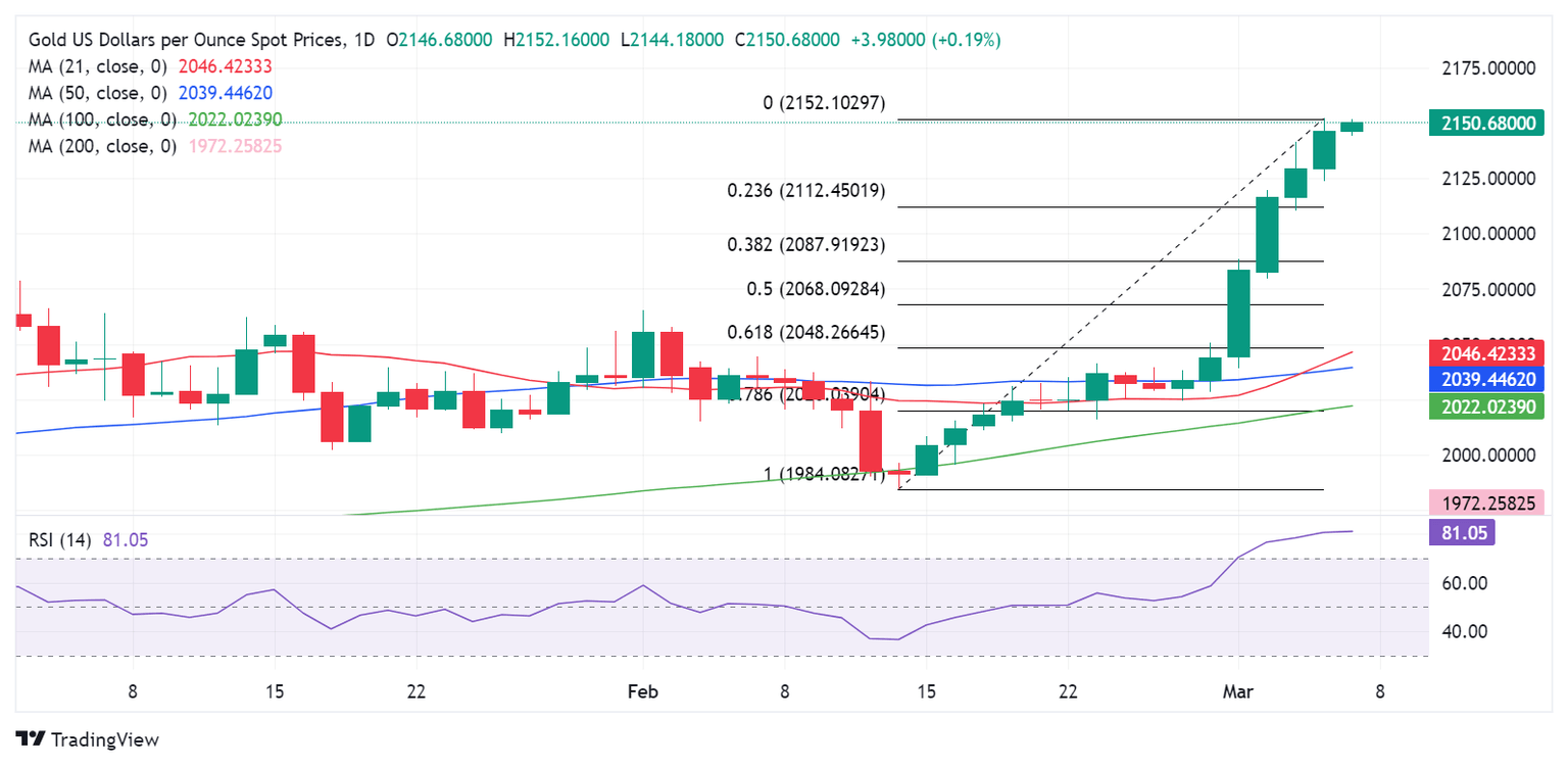 Gold Price Forecast: XAU/USD flirts with record highs near $2,150, more upside likely?