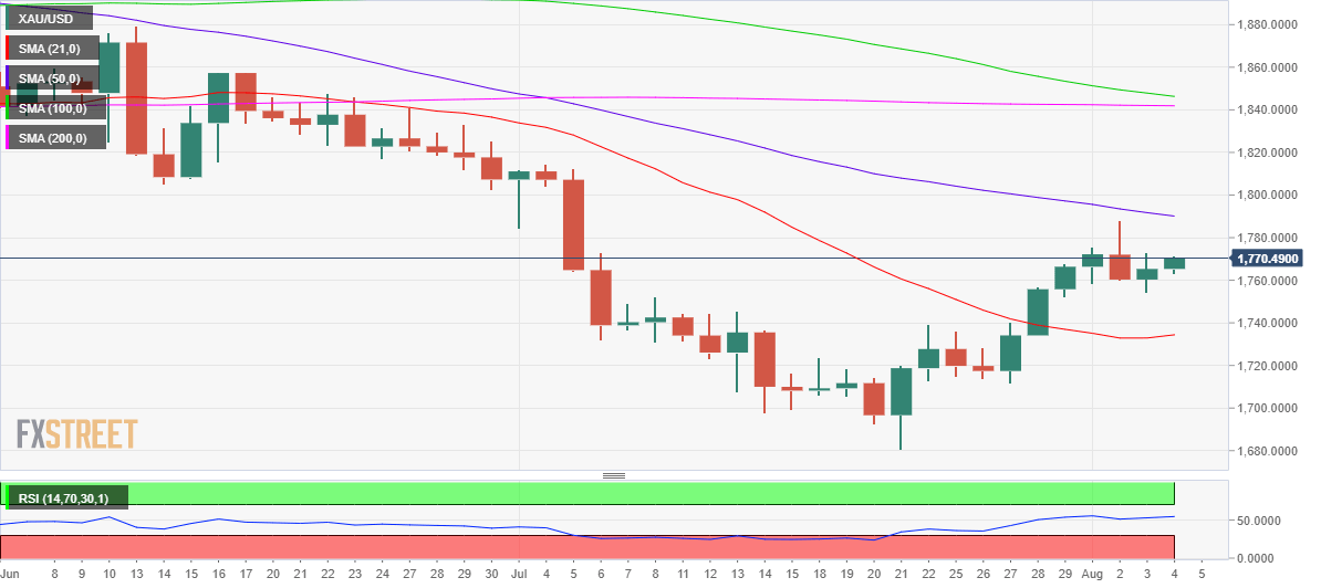 Gold price is looking to build onto Wednesday’s rebound, as bulls continue to keep their eyes on the critical $1,790 resistance amid a renewed downtick in the US dollar and the Treasury yields. Risk flows extend into Thursday’s trading so far, as investors cheer strong US corporate guidance and easing US-China tensions over Taiwan. US House Speaker Nancy Pelosi departed Taiwan on Wednesday, which has helped calm market nerves, although investors view her visit as a bigger geopolitical game. Meanwhile, fresh covid lockdowns in China and further Fed tightening expectations continue to stoke recession fears, boding well for the traditional safe-haven gold. The risks of an economic downturn are being signaled by the US bond markets, as the yields remain vulnerable despite the rebound seen earlier this week.