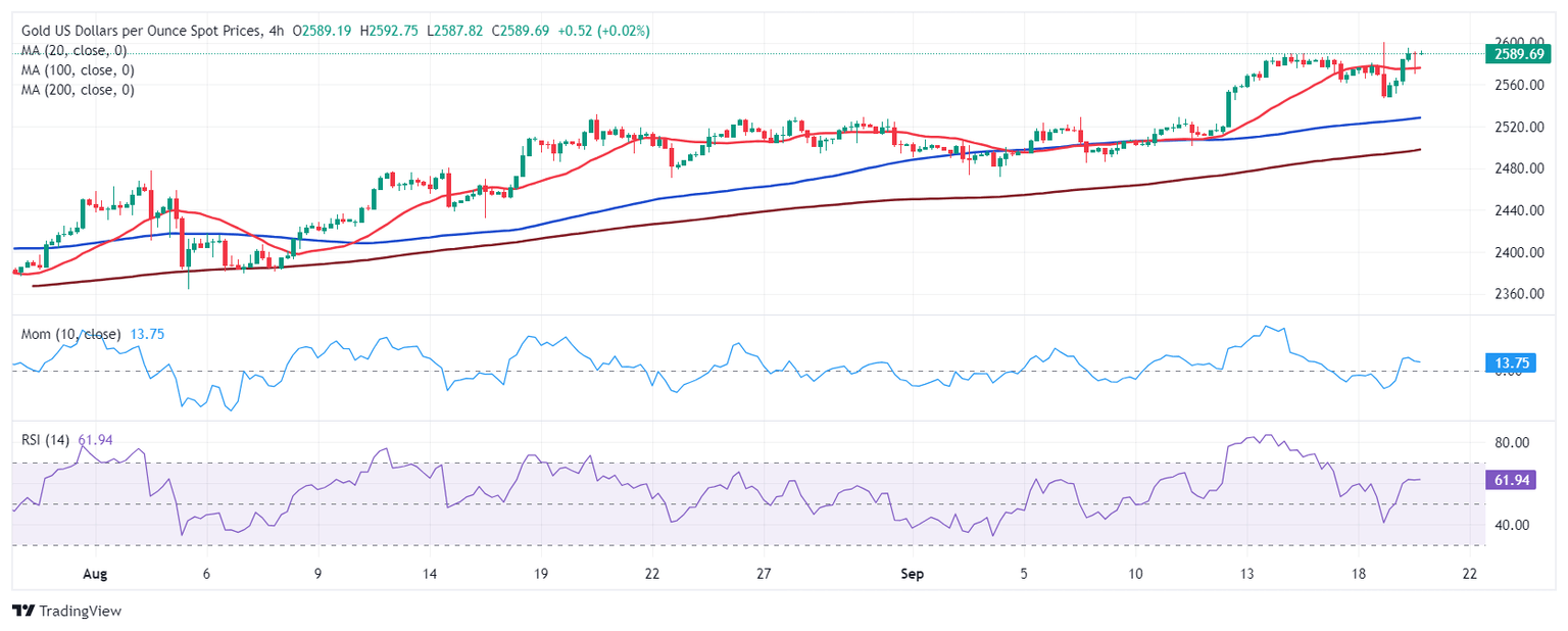 Spot Gold recovered its bullish tone early on Thursday, and traded as high as $2,594.75 a troy ounce, holding on to gains and changing hands at around $2,590 mid-American session. Stock markets reflect the optimism that harms US Dollar’s demand, following the Federal Reserve (Fed) monetary policy announcement. The Fed trimmed interest rates by more than anticipated on Wednesday, kick-starting a new monetary policy cycle with a 50 basis points (bps) cut to the benchmark rate.
