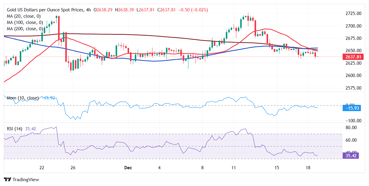 The 4-hour chart shows that the risk skews to the downside. The XAU/USD pair trades below all its moving averages, while the 20 SMA is heading firmly lower after crossing below directionless 100 and 200 SMAs. At the same time, technical indicators gain downward traction within negative levels, supporting a fresh leg lower beyond the $2,633 weekly low.