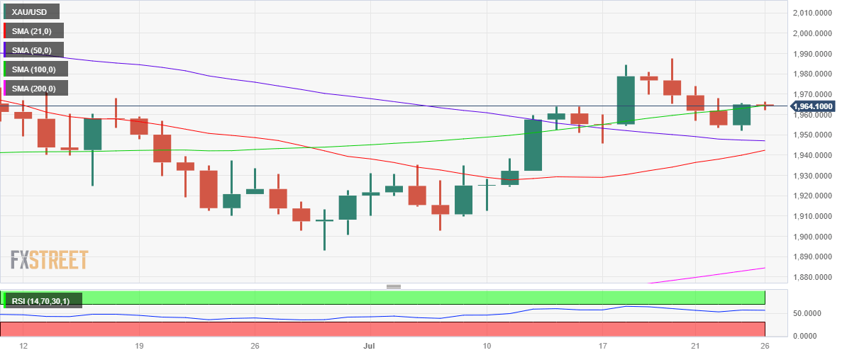 Gold price is clinging to critical 100-Daily Moving Average (DMA) at $1,964, consolidating the previous rebound from six-day lows, as investors gear up for the all-important US Federal Reserve (Fed) interest rate decision, followed by Chair Jerome Powell’s press conference.