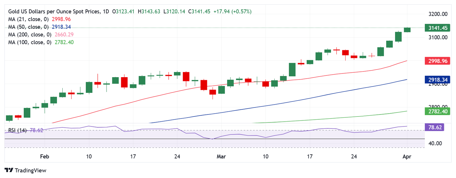 - Gold price sits at fresh record highs above $3,130 early Tuesday, awaits Wednesday’s US tariffs announcement.