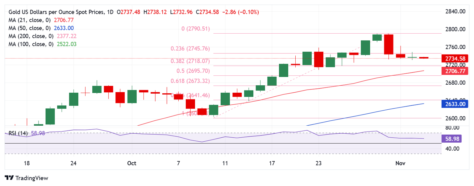Gold price is miring in five-day lows near $2,730 in Asian trading on Tuesday, lacking a clear direction. Traders remain wary and refrain from placing fresh bets on Gold price on the US presidential election day.