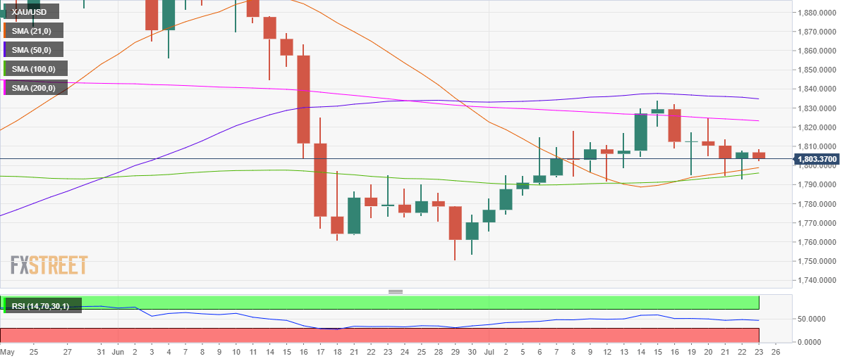 Gold bears yearn for a sustained break below $1799-$1796 support area, where the 21-Daily Moving Average (DMA) and 100-DMA intersect.