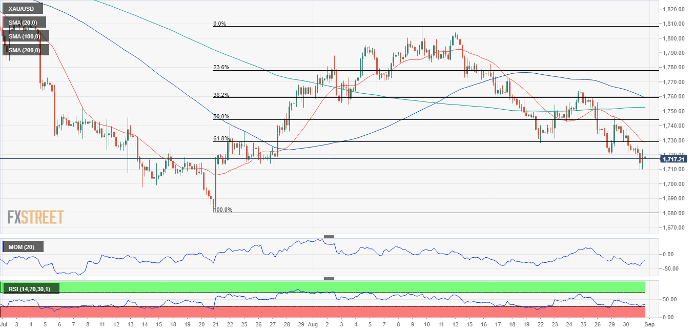 Spot gold fell to a fresh monthly low of $1,709.61 a troy ounce, maintaining the red but off the mentioned low at the time being. The dollar surged throughout the first half of the day but lost steam following the release of tepid US employment-related data. The ADP report showed that the private sector added 132K new job positions in August, much worse than the 288K expected and below the previous 270K.