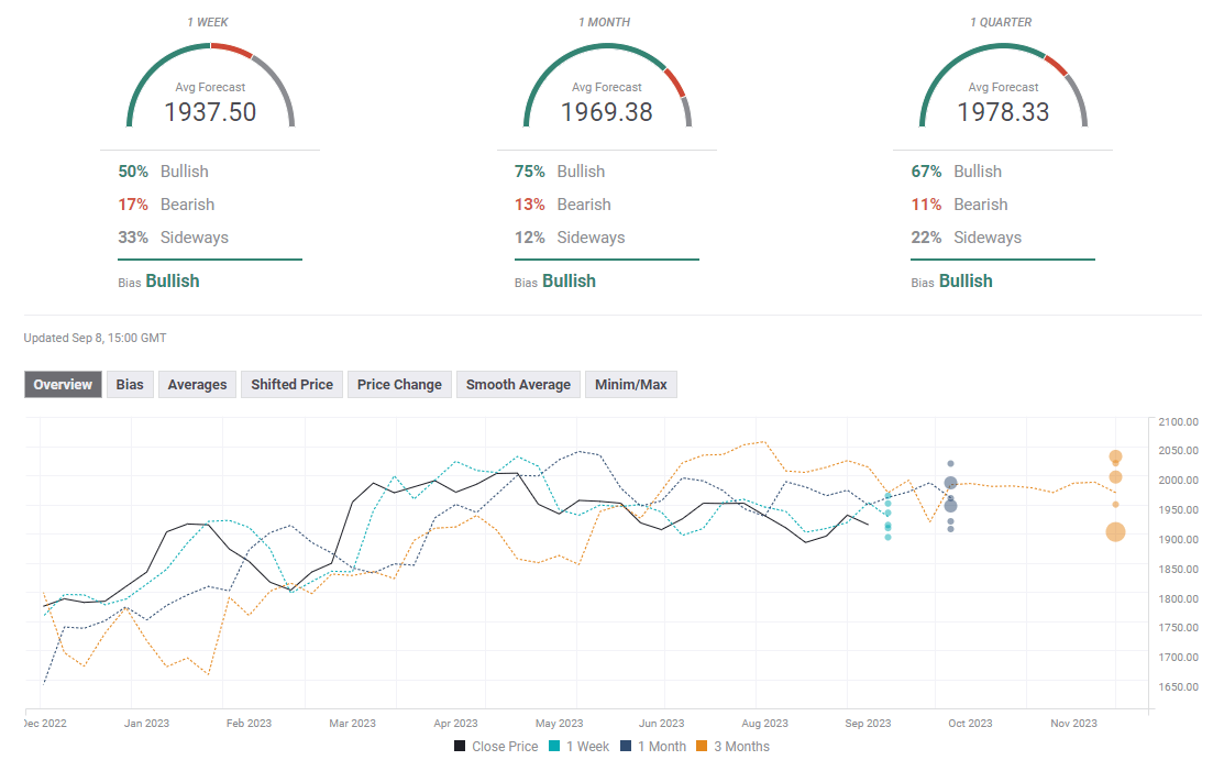 FXStreet Forecast Poll points to a slightly bullish bias in the short term, and the one-week average target aligns at $1,937. The one-month outlook remains overwhelmingly bullish, with several experts who took part in the poll seeing XAU/USD rising to or above $2,000 in that time frame.