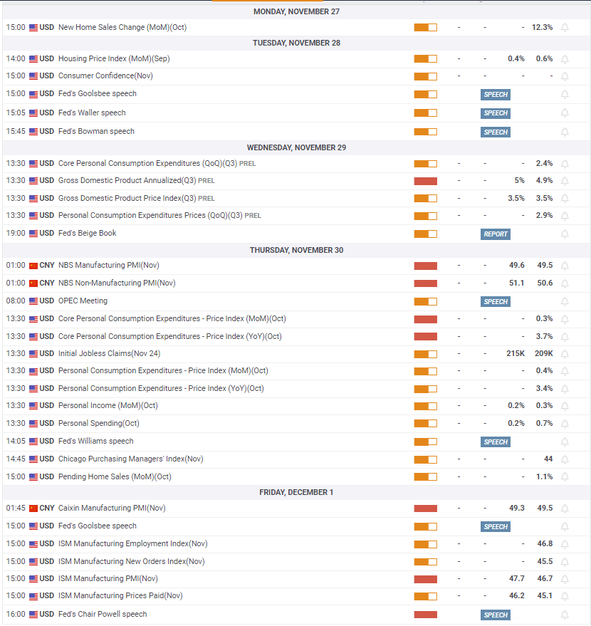 Investors will continue to pay close attention to comments from Fed officials ahead of the blackout period that will start on December 2. Before the Fed’s blackout period, Chairman Jerome Powell will deliver a speech on Friday. The CME Group FedWatch Tool shows that markets are pricing in a 22% chance that the Fed’s policy rate will remain unchanged at 5.25%-5.5% by June next year. In case Fed policymakers push back against the market positioning and try to convince participants that they will not consider rate reductions for a longer period, the USD could find a foothold and make it difficult for XAU/USD to gather bullish momentum.