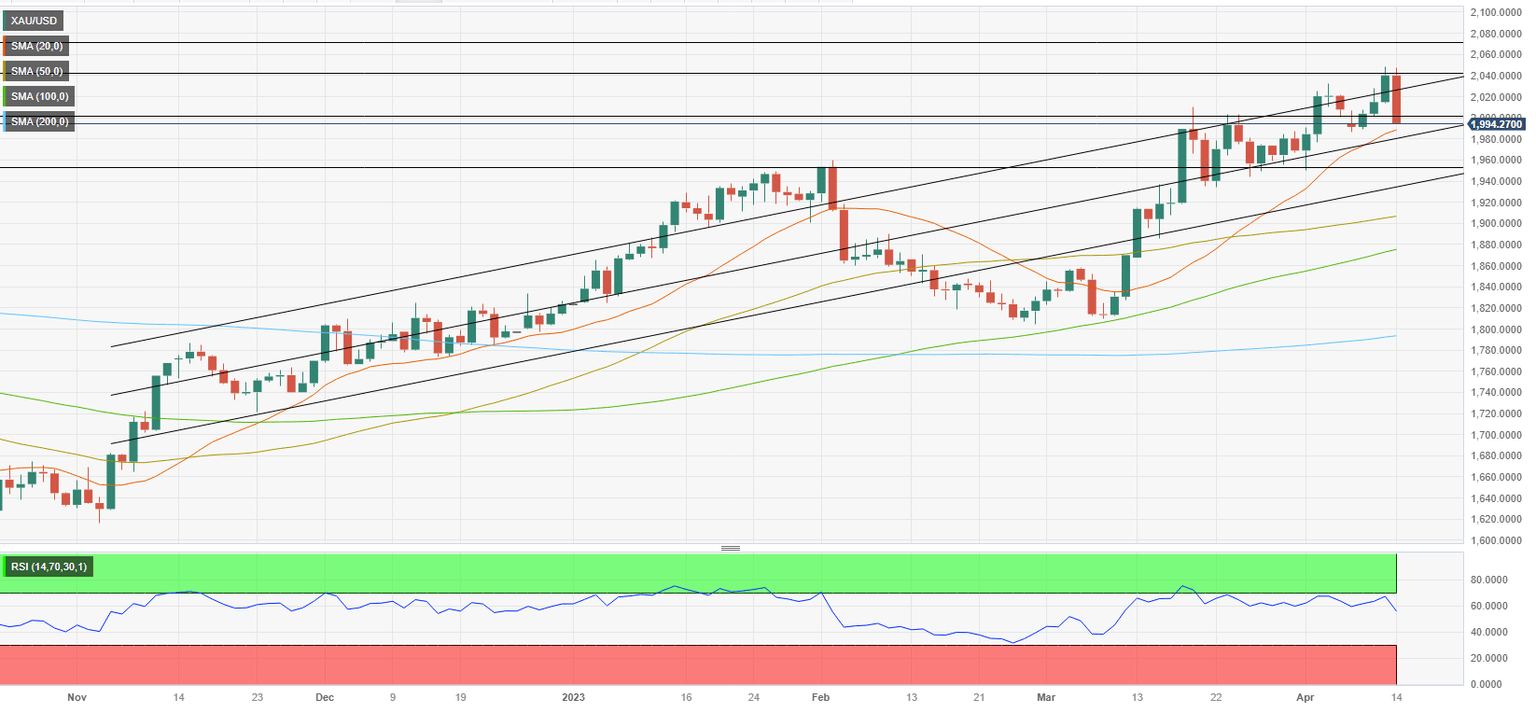 On Friday, the US Census Bureau reported that Retail Sales fell by 1% on a monthly basis in March to $691.7 billion. This reading came in worse than the market expectation for a contraction of 0.4%. Despite the disappointing data, hawkish Fed commentary helped the USD limit its losses ahead of the weekend. Federal Reserve Governor Christopher Waller argued the recent data show that the Fed hasn't made much progress on its inflation goal and noted that rates need to rise further. "Monetary policy will need to remain tight for a substantial period, and longer than markets anticipate,” Waller added. Finally, the one-year inflation expectation component of the University of Michigan's Consumer Sentiment Survey climbed to 4.6% in early April from 3.6% in March. In turn, the USD continued to gather strength ahead of the weekend and forced XAU/USD to erase its weekly gains.