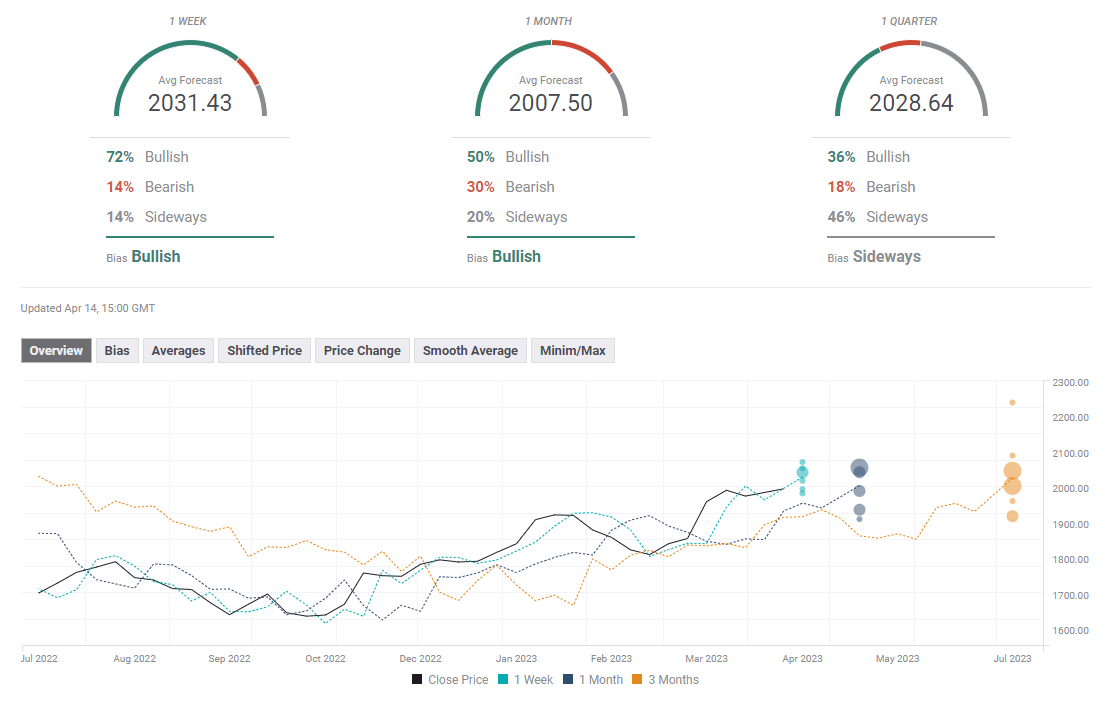 The FXStreet Forecast Poll points to a bullish bias in the near term with the one-week average target aligning at $2,031. The one-month outlook remains slightly bullish but the target is much closer to $2,000 in that time frame.