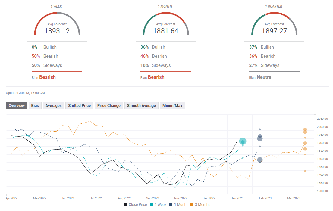 The FXStreet Forecast poll shows that experts don't expect Gold price to register significant gains next week with the average target on the one-week outlook sitting at $1,893. The one-month outlook paints a mixed picture.