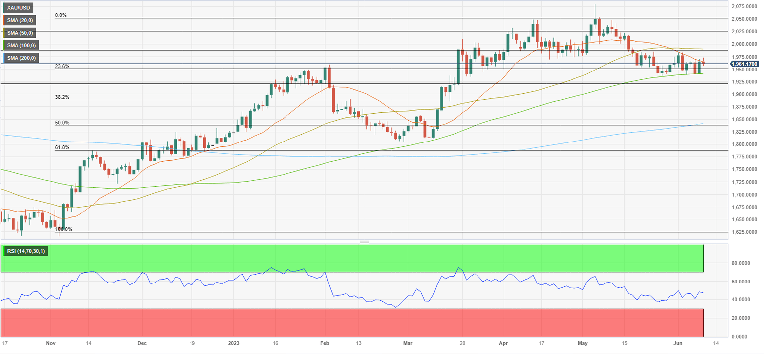 Following a quiet European session on Thursday, Gold price gathered bullish momentum and advanced toward $1,970. Initial Jobless Claims in the US jumped to 261,000 in the week ended June 3 from 233,000 a week earlier, highlighting looser labor market conditions and attracting dovish Fed bets. Signs of increasing unemployment levels mean less labor shortages, a key factor behind recent wage increases that have fueled inflation particularly in the services sector. The trading action turned subdued ahead of the weekend and XAU/USD moved up and down in a narrow channel at around $1,960 on Friday.
