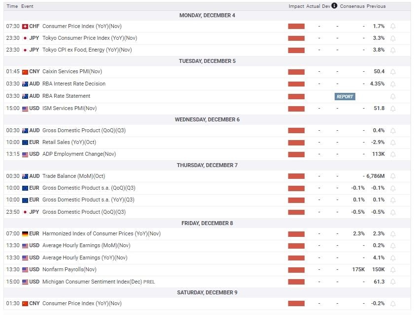 Next week, the Reserve Bank of Australia (RBA) will announce its decision on monetary policy with no expected change. The same applies to the Bank of Canada (BoC). Market participants won't be hearing from Federal Reserve officials as the central bank enters the blackout period ahead of the December 12-13 FOMC meeting.