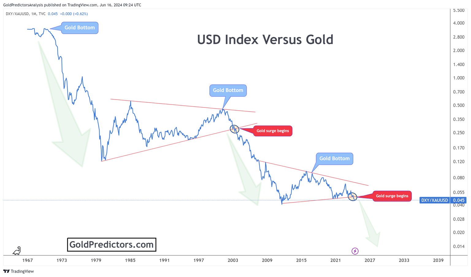 In 2024, gold already broke through a significant long-term pivot at $2075 in the spot gold market, signalling a strong bullish phase. This breakout is further validated by the USD Index to gold ratio, which has exhibited a decisive breakout from a triangle formation. Historical patterns reinforce this bullish outlook. For instance, from 1970 to 1980, the gold market experienced a substantial rally during which the USD/Gold ratio plummeted. Similarly, the early 2000s saw another surge in gold prices, coinciding with a significant drop in this ratio, as shown in the chart below.