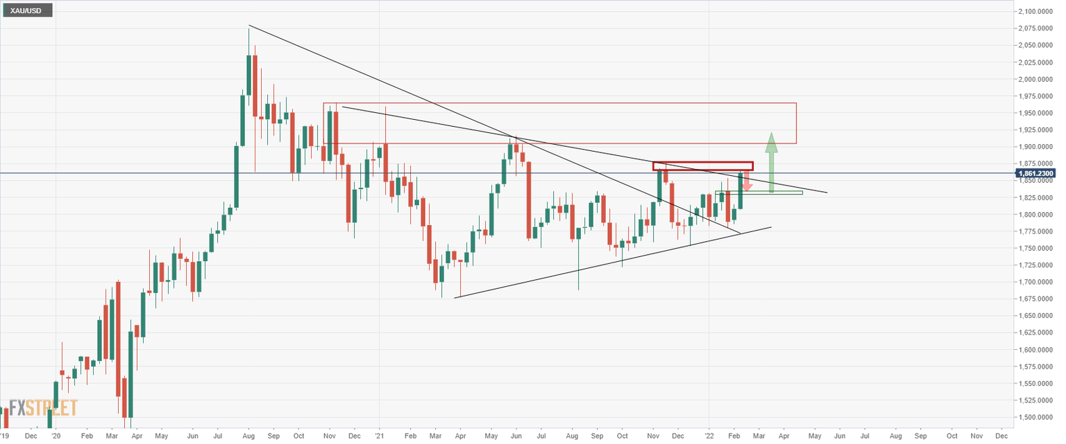 Risk aversion spiked late in the New York session as the US warned its citizens to leave Ukraine within 48 hours due to Russian invasion risks. This sent Wall Street into a tailspin and sent the US 10-year Treasury yields crashing below daily support from 2.061% to a session low of 1.915%. The greenback remained in positive territory in the 96 areas, DXY. However, for its haven allure, gold buyers emerged and the following illustrates past and prospective price action in a top-down analysis.