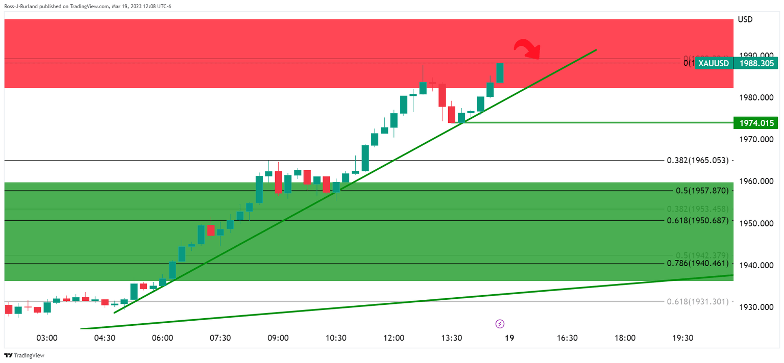 The following is a series of charts that illustrate the current resistance areas and potential support structure as Gold heads into the extremities of the $1,980s with prospects of a meanwhile correction ahead of the Fed: