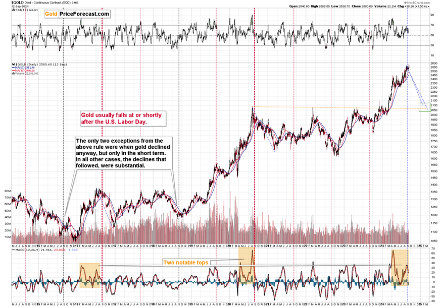 Why am I bringing this up right now? Because I want to emphasize that this week’s move higher in gold does NOT invalidate the overall tendency for it to move lower after the Labor Day. It doesn’t have to happen immediately. And if you go back to the chart featuring the price moves following the previous Labor Days, you’ll see that the declines were well worth waiting for.