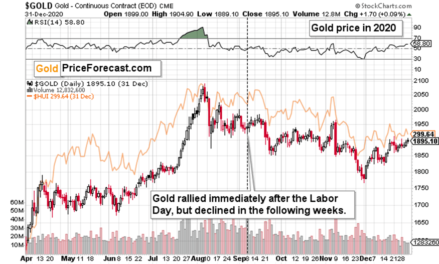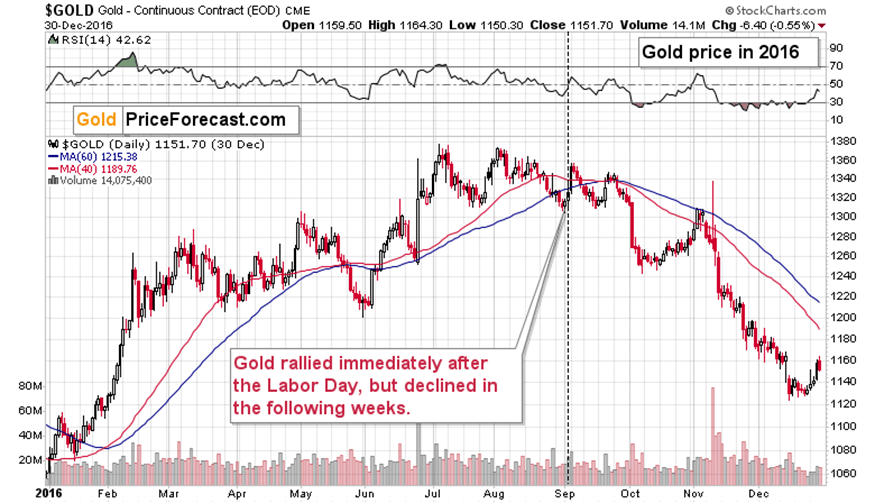 It turns out that in both cases, gold did not decline immediately after the Labor Day. Conversely, it moved higher. The point is, however, that this move up – again, in both cases – was short-lived.
