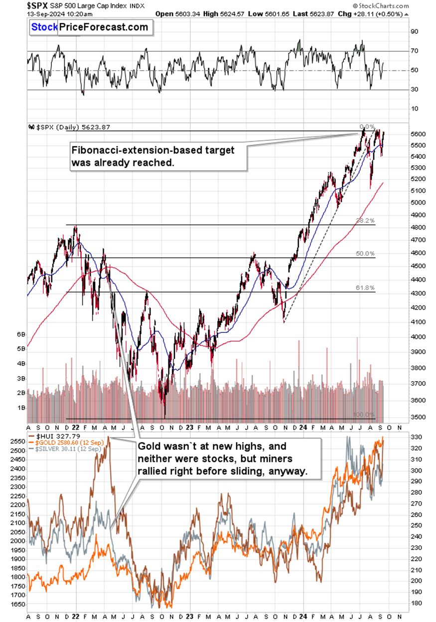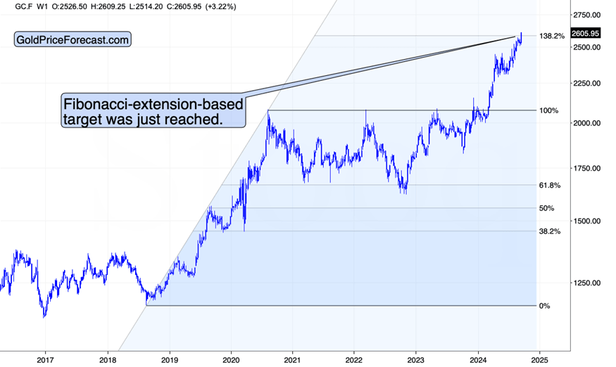 On a more long-term chart, we see that based on gold’s most recent upswing, it reached it’s Fibonacci-extension-based target, which means that perhaps what was likely happen based on this technique, has already happened.