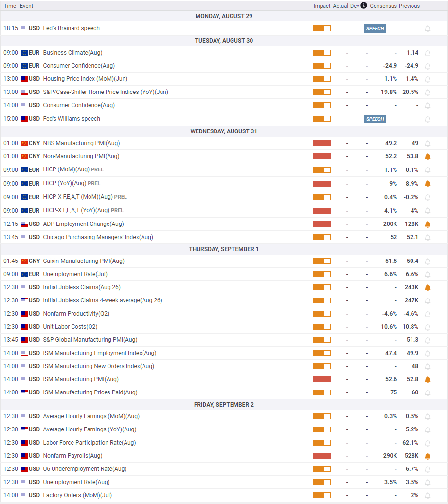 There won’t be any high-impact data releases on Monday and gold’s trading action is likely to remain muted. On Tuesday, the Conference Board’s Consumer Confidence Index for August will be looked upon for fresh impetus. The softening inflation in July may have helped the consumer sentiment improve in August and such an outcome could help the dollar outperform its rivals.