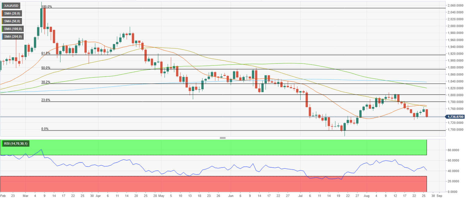 On Friday, the monthly report published by the BEA revealed that inflation in the US, as measured by the Personal Consumption Expenditures (PCE) Price Index, declined to 6.3% in July from 6.8% in June. Combined with this soft inflation data, dovish comments from Atlanta Fed President Raphael Bostic triggered a dollar selloff. Bostic noted that he was leaning toward a 50 bps rate hike in September after seeing the latest PCE inflation figures. FOMC Chairman Jerome Powell, however, helped the dollar to rise strongly as he reiterated his hawkish stance by saying that restoring the price stability will likely require maintaining a restrictive policy stance for 'some time.' Regarding the September policy move, Powell said that the decision will be based on the totality of data since the July meeting. After all the dust settled, XAU/USD turned south and dropped below $1,740, erasing all of its weekly gains in the process.