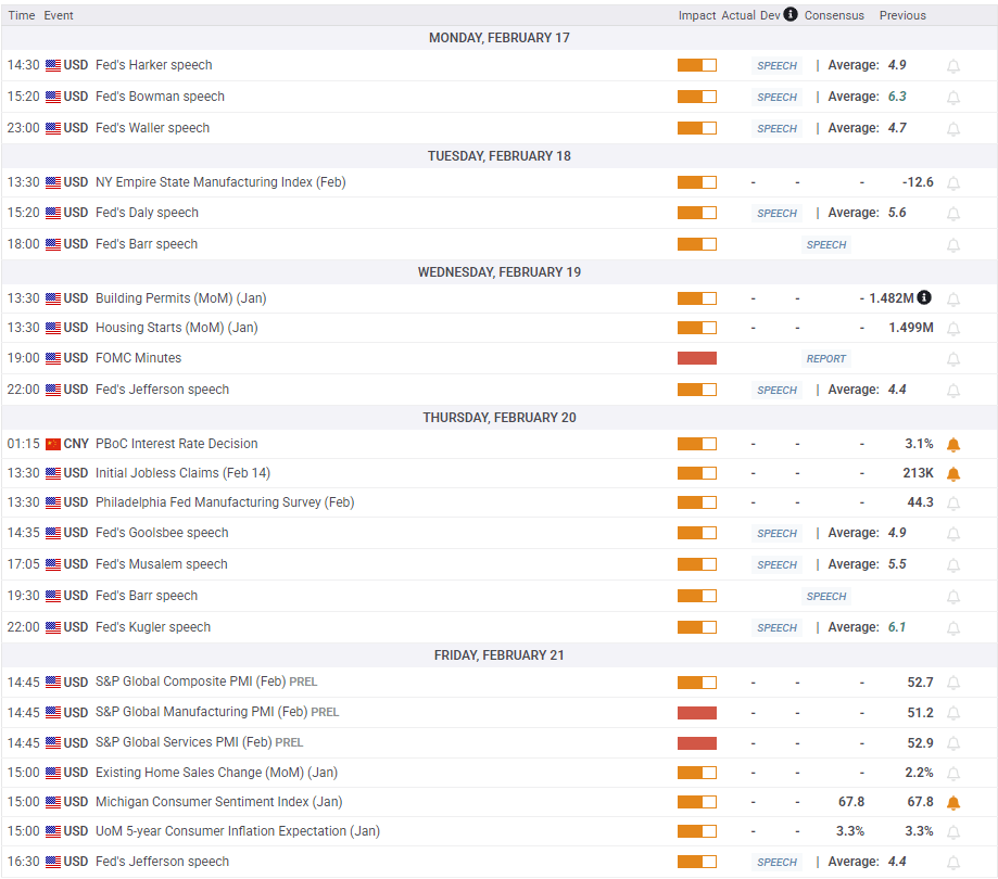 The economic calendar will offer only a few high-impact events. On Wednesday, the Fed will publish the Minutes of the January policy meeting. Following Powell’s testimony and the latest inflation report, investors are unlikely to pay much attention to this document. The CME Group FedWatch Tool currently shows markets virtually see no chance of an interest rate cut in March and price in around a 20% probability of a 25 basis points (bps) rate reduction in May.
