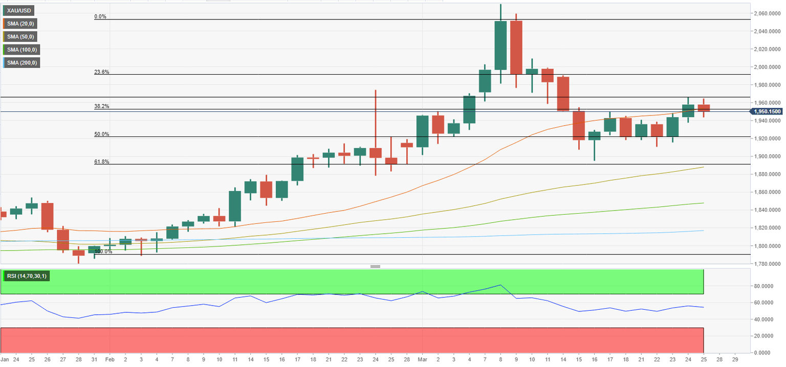 On the flip side, XAU/USD could face renewed bearish pressure if it fails to hold above $1,950 and decline toward $1,920 (static level, lower limit of the consolidation channel). With a daily close below that level, the pair could test $1,900 (Fibonacci 61.8% retracement, 50-day SMA).