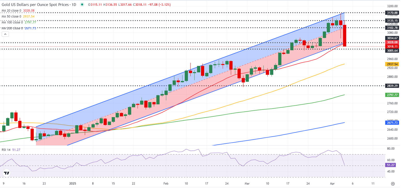 However, growing fears over the US’ trade policy weighing on the global economic activity and hurting the precious metal’s demand outlook caused XAU/USD to reverse its direction. Investors may also have seen the opportunity to book some profits before receiving more details on the trade war. After dropping all the way to $3,054, Gold recovered a portion of its daily losses before ending the day 0.65% lower on Thursday.