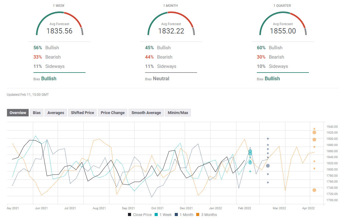 FXStreet Forecast Poll shows investors expect gold to continue to edge higher in the short term with the average target on the one-week view sitting at $1,835. The one-month view paints a mixed picture with experts splitting evenly on gold's next direction.