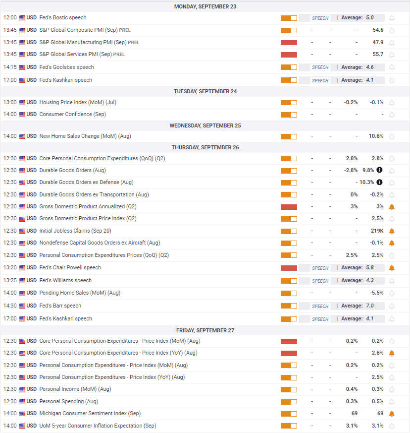 The US economic calendar will feature the preliminary S&P Global Manufacturing and Services Purchasing Managers Index (PMI) data for September on Monday. In case the Manufacturing PMI recovers above 50 and the Services PMI holds comfortably above 50, investors are likely to be encouraged about the robust economic outlook. In this case, the USD could stay resilient against its major rivals and cause XAU/USD to correct lower. On the other hand, weaker-than-forecast PMI readings are likely to have the opposite effect on the USD’s valuation.