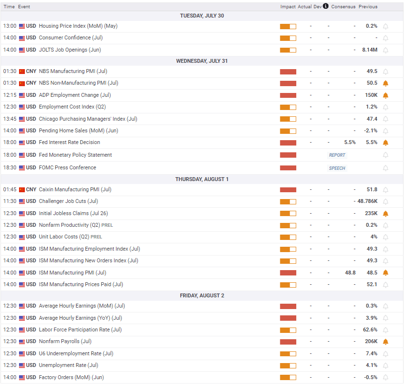 The Fed is widely expected to leave its policy rate unchanged following the July 30-31 meeting. According to the CME FedWatch Tool, a 25 basis points (bps) Fed rate cut is fully priced in at the September meeting, suggesting that the USD doesn’t have a lot of room on the downside even if the Fed policy statement, or Fed Chairman Jerome Powell, confirms a rate reduction in September.