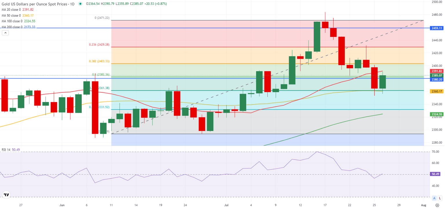 During the Asian trading hours on Thursday, the PBoC said that it lowered the one-year Medium-term Lending Facility (MLF) rate from 2.50% to 2.30%. This decision, combined with the rate cuts announced earlier in the week, caused investors to grow increasingly concerned over the Chinese economic outlook. In turn, Gold came under renewed bearish pressure and dropped below $2,400. Later in the day, the US Bureau of Economic Analysis reported that the US Gross Domestic Product (GDP) expanded at an annual rate of 2.8% (first estimate) in the second quarter. This reading followed the 1.4% growth recorded in the first quarter and surpassed the market expectation of 2% by a wide margin. Other data from the US showed that the weekly Initial Jobless Claims declined to 235,000 in the week ending on July 20 from 243,000 in the previous week. XAU/USD extended its daily slide following the upbeat US data and touched its weakest level in two weeks below $2,360 in the American trading hours.