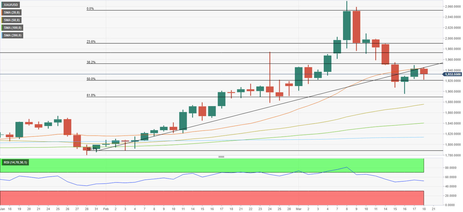 Following its two-day policy meeting, the US Federal Reserve announced on Wednesday that it would hike the policy rate by 25 basis points (bps). The revised Summary of Projections revealed that policymakers were expecting six more rate hikes by the end of the year. The initial market reaction to the Fed’s hawkish rate outlook lifted the 10-year US Treasury bond yield to its highest level since May 2019 at 2.23% and forced gold to decline below $1,900. During FOMC Chairman Jerome Powell’s press conference, yields started to retreat and the dollar lost interest, triggering a rebound in XAU/USD.