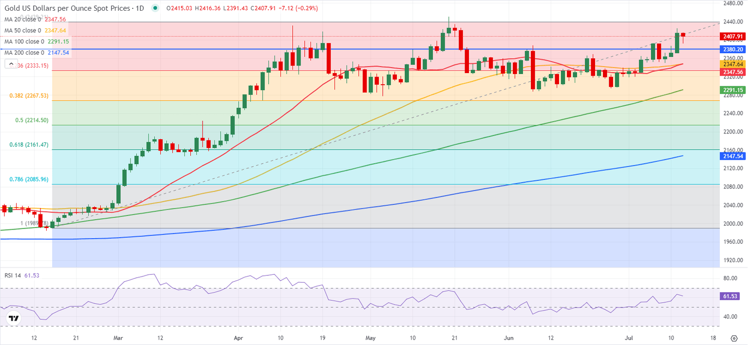 The US Bureau of Labor Statistics reported that inflation in the US, as measured by the change in the Consumer Price Index (CPI), softened to 3% on a yearly basis in June. The annual core CPI, which excludes volatile food and energy prices, rose 3.3% in the same period, below the market forecast and May's increase of 3.4%. On a monthly basis, the CPI declined 0.1%, while the core CPI was up 0.1%. The benchmark 10-year US Treasury bond yield declined below 4.2% with the immediate reaction, and the USD came under heavy selling pressure. As a result, Gold gathered bullish momentum and climbed above $2,420 for the first time since late May.