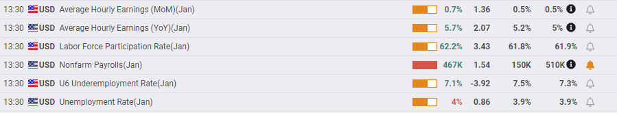 On Friday, the US Bureau of Labor Statistics (BLS) announced that Nonfarm Payrolls increased by 467,000 in January, surpassing the market expectation of 150,000. Additionally, the December print got revised higher to 510,000 from 199,000. Underlying details of the jobs report showed that annual wage inflation climbed to 5.7% from 5% and the Labor Force Participation rate improved to 62.2% from 61.9%. The US Dollar Index edged higher after the data and the 10-year US T-bond yield rose to 1.9%, causing gold to return to the $1,800 area.