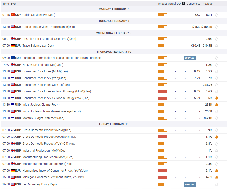 Following the previous week’s sharp decline, gold managed to stage a rebound during the first half of the week with the dollar struggling to find demand. Rising US Treasury bond yields capped XAU/USD’s upside on Thursday and the upbeat January jobs report from the US didn't allow the pair to gather bullish momentum. Gold is likely to remain inversely correlated with the benchmark 10-year US T-bond yield next week as investors will await the US January Consumer Price Index (CPI) data, which could impact the market odds of a 50 basis points (bps) Fed rate hike in March.