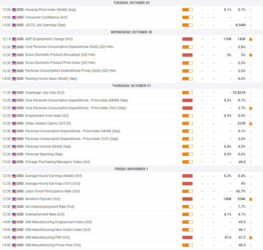 The US Bureau of Economic Analysis (BEA) will publish the first estimate of the annualized Gross Domestic Product (GDP) growth for the third quarter on Wednesday. Investors forecast the US GDP to expand by 3% in this period, matching the growth recorded in the second quarter. A reading above the market expectation could boost the USD as the immediate reaction and cause XAU/USD to stretch lower. On the other hand, a disappointing GDP print, between 1% and 2%, could hurt the USD.